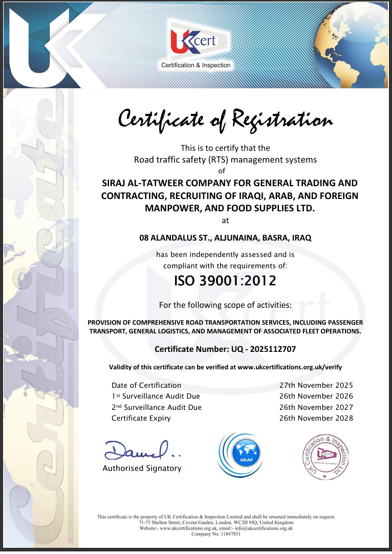 2025112707 - siraj al-tatweer company for general trading and contracting- recruiting of iraqi- arab- and foreign manpower- and food supplies ltd. - iso 39001-2012