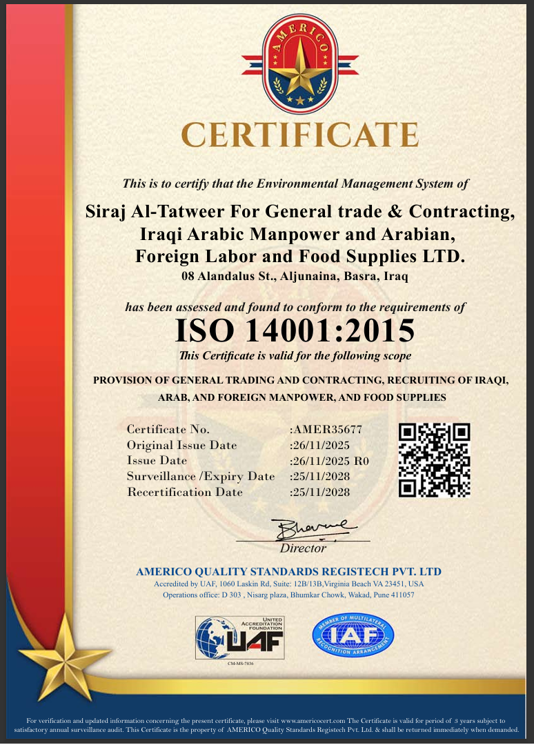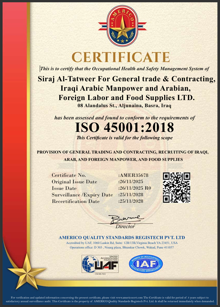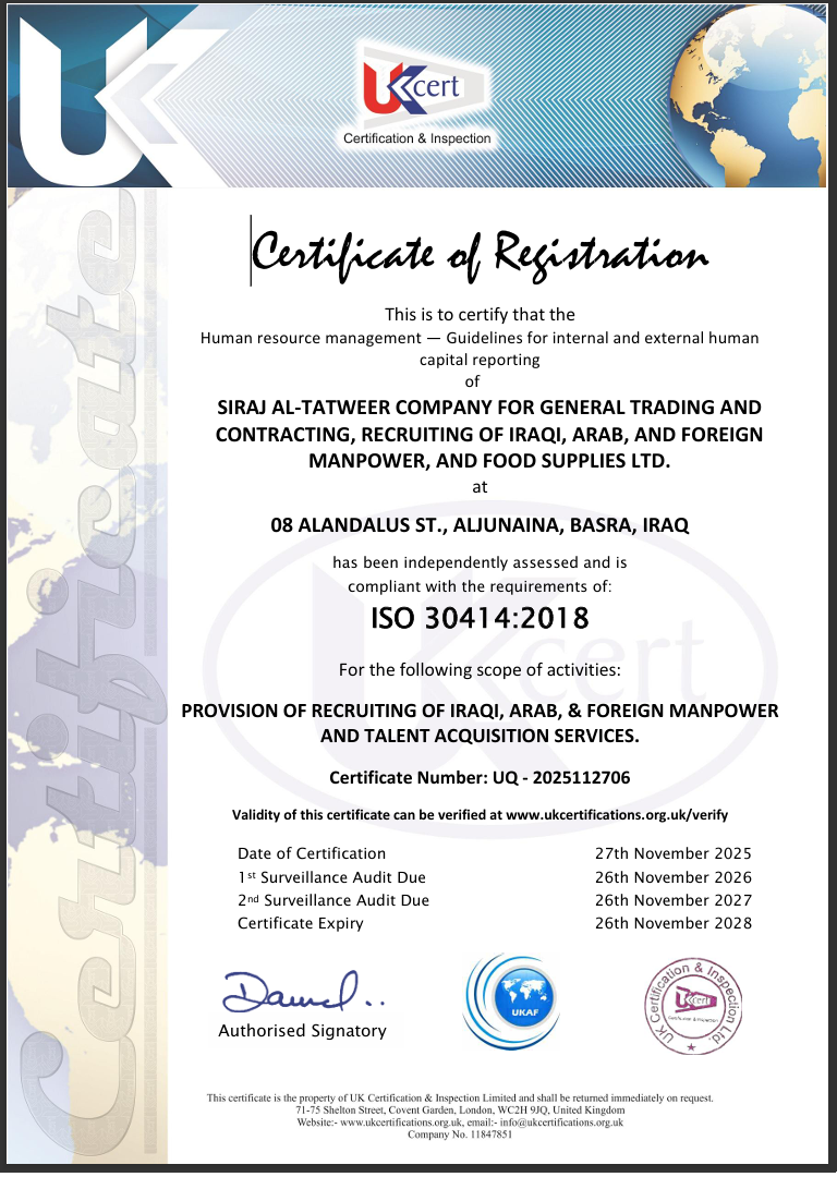 2025112706 - siraj al-tatweer company for general trading and contracting- recruiting of iraqi- arab- and foreign manpower- and food supplies ltd. - iso 30414-2018